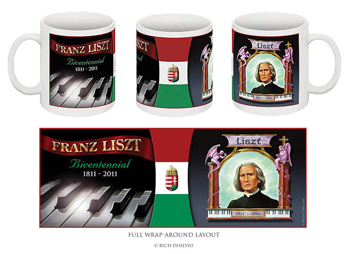| This special edition ceramic coffee mug features custom memorial artwork by Rich DiSilvio of the famous Hungarian composer Franz Liszt. Originally created for the Metropolitan Opera in 1992 as part of the Pantheon of Composers series, DiSilvio's artwork features the composer/pianist in a unique memorial that features both demonic and angelic figures along with a keyboard that are indicative of the full breadth of Liszt's world-view, which dove into the pits of Hell or soared into the sublime regions of Heaven. The artwork for this bicentennial piece features a wrap-around design that includes the Hungarian flag and a divinely lit keyboard, indicative of Liszt's unrivalled mastery of the piano.