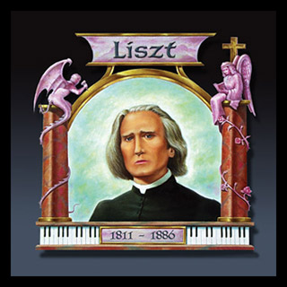 | This special edition ceramic coffee mug features custom memorial artwork by Rich DiSilvio of the famous Hungarian composer Franz Liszt. Originally created for the Metropolitan Opera in 1992 as part of the Pantheon of Composers series, DiSilvio's artwork features the composer/pianist in a unique memorial that features both demonic and angelic figures along with a keyboard that are indicative of the full breadth of Liszt's world-view, which dove into the pits of Hell or soared into the sublime regions of Heaven. The artwork for this bicentennial piece features a wrap-around design that includes the Hungarian flag and a divinely lit keyboard, indicative of Liszt's unrivalled mastery of the piano.