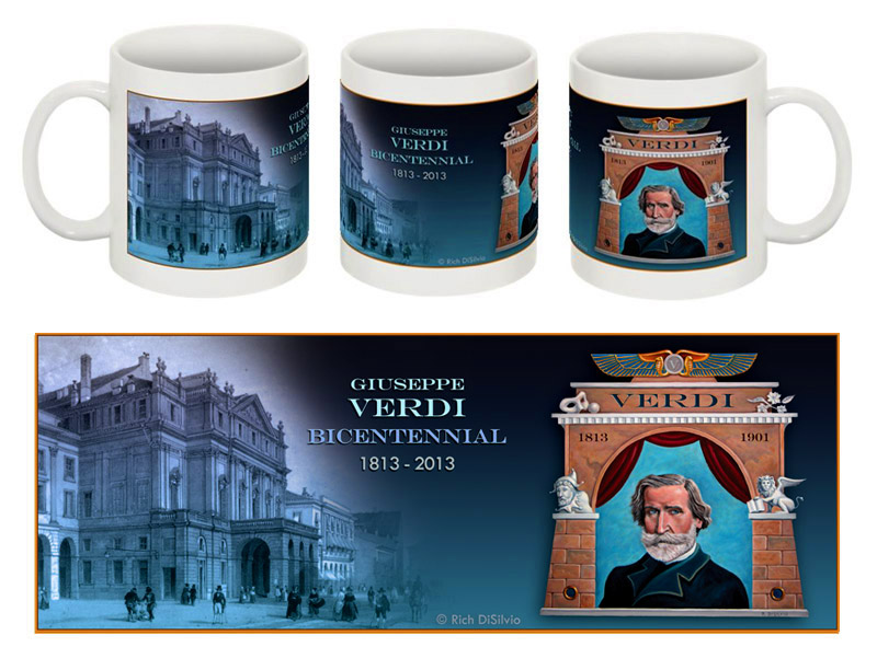 | This special edition ceramic coffee mug features custom memorial artwork by Rich DiSilvio of the great Italian opera composer Giuseppe Verdi. Originally created for the Metropolitan Opera in 1992 as part of the Pantheon of Composers series, DiSilvio's unique artwork features the composer in a memorial that features decorative sculptural symbols from several of Verdi's operas, namely Aida, Un Ballo in Maschera, La Traviata, Rigoletto, and Othello. The memorial likewise features Roman and Renaissance styling, thus forming a fitting tribute to this great master of Italian opera. The artwork for this bicentennial piece features a wrap-around design that includes La Scala, the world famous opera house in Milan, Italy that premiered many of Verdi's successful operas, which still enjoy a solid place in the repertoire...and always will. So, don't miss out on this special tribute. Order now!